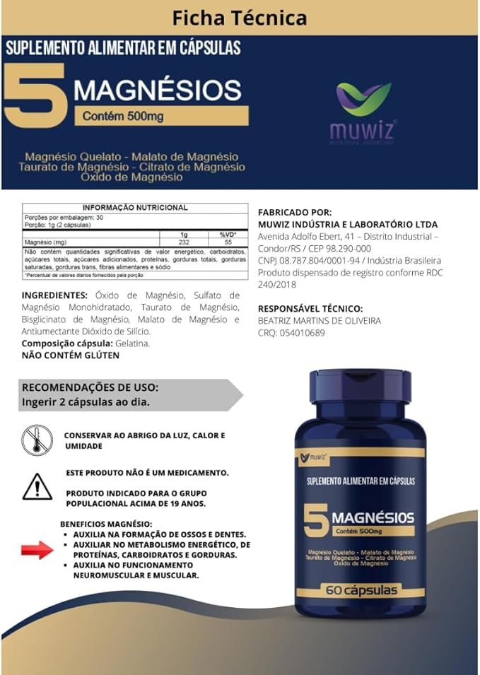 5 Magnésios da Muwiz, como o próprio nome já diz, é composto por 5 tipos de magnésios. Auxilia na formação de ossos e dentes, no metabolismo energético e no metabolismo de proteínas, carboidratos e gorduras.