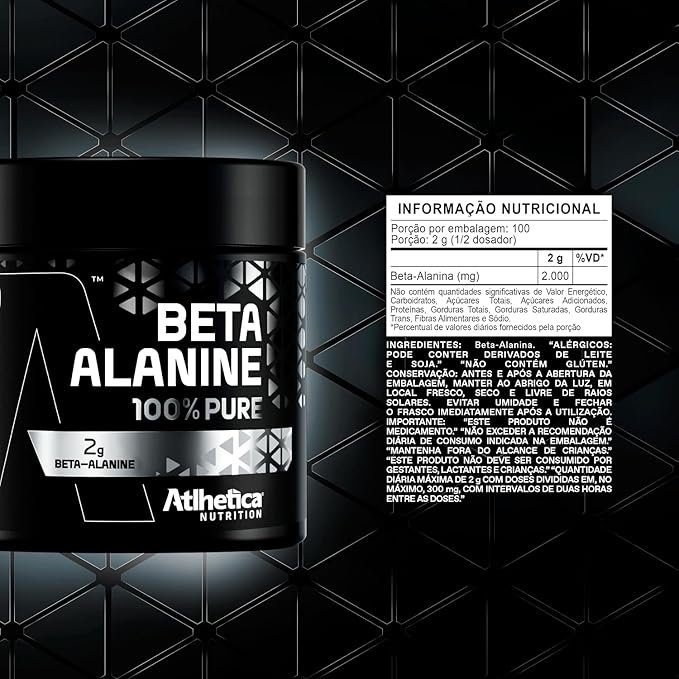 Beta-Alanina 100% Pure tem fórmula inteligente para que seu organismo possa entender seu potencial. É pura beta-alanina! Beta-alanina pura, auxiliando na redução da fadiga e recuperação muscular, fornecendo a energia ideal e potencializando seu treino diário. A principal função da beta-alanina no corpo é reduzir a fadiga muscular durante treinos de alta intensidade, o que ajuda a melhorar o desempenho durante sua prática. Isso ocorre porque a beta-alanina participa da formação da carnosina, regulando as células musculares e retardando a fadiga muscular. O aminoácido pode ajudar a aumentar a resistência física, força, crescimento muscular e melhorar o desempenho atlético durante períodos mais longos de treinos. BENEFÍCIOS BETA ALANINA 100% PURE: – 2.000mg de Beta-alanina pura; – Menos Fadiga; – Mais Performance; – Mais Resistência; – 100% Pure; – Sem Lactose; – Sem Glúten.