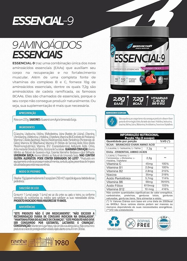 Essencial – 9 (225g) essencial-9 traz uma combinação única dos nove aminoácidos essenciais (eaas) que auxiliam seu corpo na recuperação e no fortalecimento muscular; além de uma completa fonte de vitamina c e do complexo b, fornece 10g de aminoácidos essenciais, dentre os quais 7,2g são aminoácidos de cadeia ramificada, os famosos bcaas; eles são chamados de “essenciais”, porque o seu corpo não consegue produzir naturalmente. ou seja, sua suplementação é mais que necessária; essencial-9 possui fórmula altamente tecnológica de rápida absorção e eficácia, que evita o catabolismo muscular e melhora a resistência, auxiliando também no desempenho. .