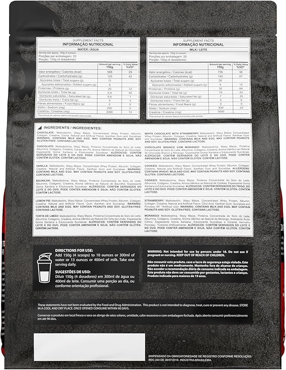 Maltodextrina, Waxy Maize, proteína concentrada do leite, soro do leite, albumina, colágeno, creatina, mix de vitaminas e minerais, espessante goma xantana e edulcorante sucralose.