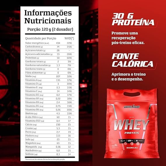 Com fórmula de fácil solubilidade e delicioso sabor, nutri whey protein fornece, na porção diária, 30 g das melhores proteínas combinadas a uma rica oferta energética. As proteínas do soro de leite (whey protein), albumina e colágeno estão relacionadas com funções importantes no organismo, sobretudo na composição das estruturas musculares. Já os carboidratos complexos (maltodextrina) e simples (frutose) são essenciais no fornecimento de energia para os treinos. Isento de sacarose (açúcar), nutri whey protein ainda é fonte de bcaa e adicionado de vitaminas e minerais.