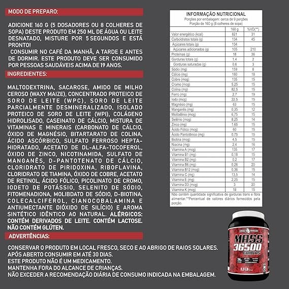 Hipercalórico: Maltodextrina, sacarose, amido de milho ceroso (waxy maize), concentrado proteico de soro de leite (WPC), soro de leite parcialmente desmineralizado, isolado proteico de soro de leite (WPI), colágeno hidrolisado, caseinato de cálcio, mistura de vitaminas e minerais (carbonato de cálcio, óxido de magnésio, bitartarato de colina, ácido ascórbico, sulfato ferroso hepta-hidratado, acetato de dl-alfa-tocoferol, óxido de zinco, nicotinamida, sulfato de manganês, d-pantotenato de cálcio, cloridrato de piridoxina, riboflavina, cloridrato de tiamina, óxido de cobre, acetato de retinol, ácido fólico, picolinato de cromo, iodeto de potássio, selenito de sódio, fitomenadiona, molibdato de sódio, d-biotina, colecalciferol, cianocobalamina e antiumectante dióxido de silício), biscoito crocante sabor chocolate {farinha de trigo enriquecida com ferro e ácido fólico, açúcar, gordura de palma, cacau em pó, sal, emulsificante lecitina de soja, fermentos químicos (pirofosfato ácido de sódio e bicarbonato de sódio) e corante caramelo iv} e aroma sintético idêntico ao natural. CONTÉM GLÚTEN. ALÉRGICOS: CONTÉM DERIVADOS DE LEITE, SOJA E TRIGO. CONTÉM LACTOSE. PODE CONTER AMENDOIM, AVEIA, AVELÃ, CASTANHA-DE-CAJU, CASTANHA-DO-PARÁ, CENTEIO, CEVADA, GERGELIM, LEITE, MACADÂMIA E NOZES. Creatina: Maltodextrina, creatina mono-hidratada e antiumectante dióxido de silício. BCAA Gold: Maltodextrina, L-Leucina, L-Isoleucina, L-Valina, Cloridrato de Piridoxina (Vitamina B6)