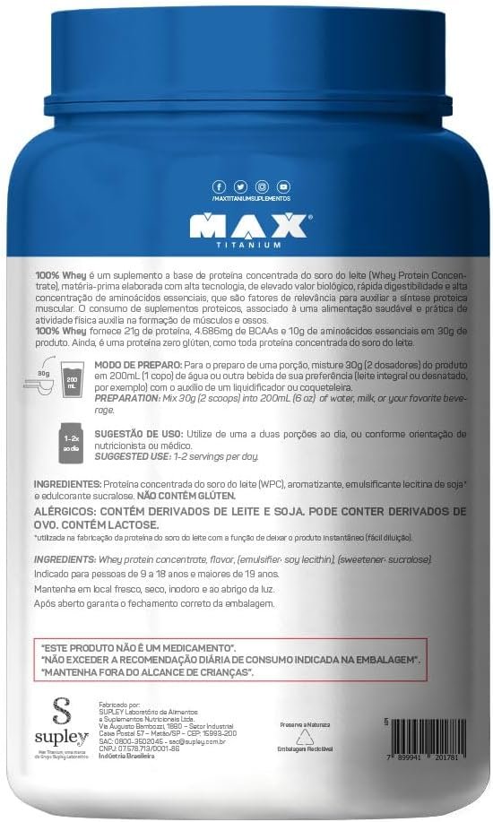 100% Whey Protein Max Titanium é um suplemento à base de proteína específica do soro do leite (Whey Protein Concentrate), matéria-prima elaborada com alta tecnologia, de elevado valor biológico, rápida digestibilidade e alta concentração de aminoácidos essenciais, que são fatores de relevância para auxiliar a síntese proteica muscular. O consumo de suplementos proteicos, associado a uma alimentação saudável e prática de atividade física auxilia na formação de músculos e ossos. Benefícios: – Fornece de 20 a 21g de proteínas, por porção; – Até 4,8g de BCAA, por porção; – Mais de 10g de Aminoácidos Essenciais, por porção; – Alto valor biológico; – Coadjuvante na formação de massa muscular; – Recuperação muscular pós-treino;