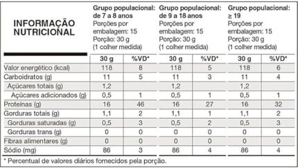 Proteína concentrada do soro do leite (WPC), Proteína isolada do soro do leite (WPI), Proteína hidrolisada do soro do leite (WPH), mix de vitaminas e minerais (ácido ascórbico (vitamina C), nicotinamida (vitamina B3), acetato de Dl-alfa-tocoferol (vitamina E), D-pantotenato de cálcio (vitamina B5), cloridrato de piridoxina (vitamina B6), riboflavina (vitamina B2), tiamina mononitrato (vitamina B1), sulfato cúprico (cobre), acetato de retinol (vitamina A), ácido fólico, iodeto de potássio (iodo), molibdrato de sódio (molibdênio), picolinato de cromo (cromo), selenito de sódio (selênito) D-biotina (vitamina H), cianocobalamina (vitamina B12)), emulsificante lecitina de soja, aromatizante e edulcorante sucralose. NÃO CONTÉM GLÚTEN. CONTÉM DERIVADOS DE LEITE, SOJA E OVO.